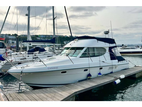 "Castaway" is a very well presented and clearly loved example of these very popular 32 foot flybridge models. She has a fantastic specification including, Bennett trim tabs, bow thruster, teak decking, new canopy covers 2025, Eberspacher diesel heating, VHF radios, Raymarine GPS chart plotters, Garmin fish finder, Sony radio / CD player, Raymarine, speed & depth gauge, microwave, 3 burner gas hob, fridge etc.