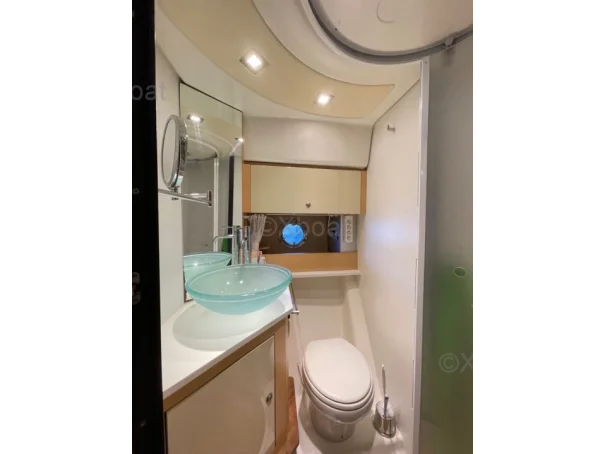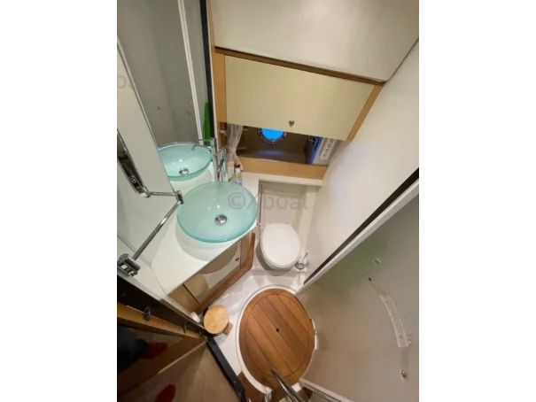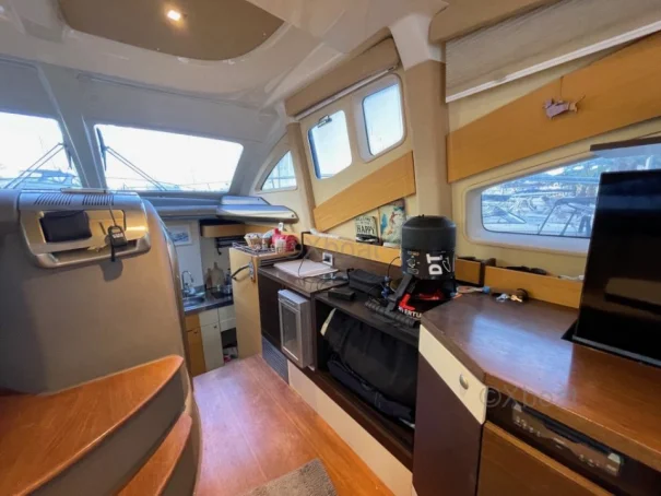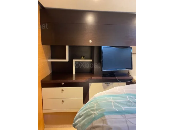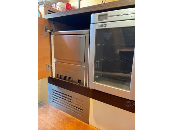 Nous l'avons équipé de tout ce qui est nécessaire à bord pour la croisière :grand capacité des batteries de services, générateur 3,5 kVa pour la clim et les équipements de bord, il y a aussi un convertisseur, une machine à glaçons, 2 frigos, une antenne satellite pour la TV Immersat, la passerelle est hydraulique, il y a une machine à laver le linge. L'annexe et son moteur sont en option (ne sont pas inclus dans le prix de vente).