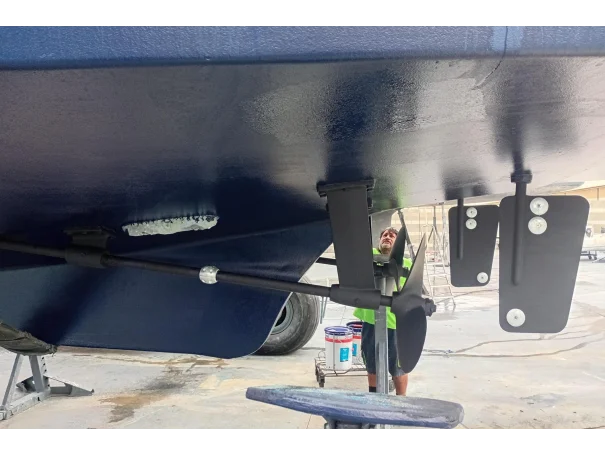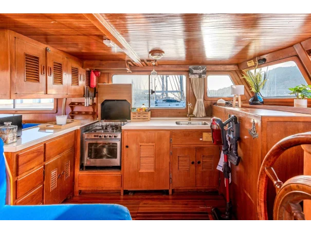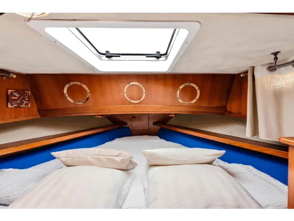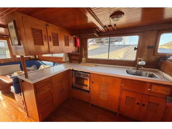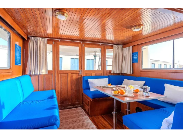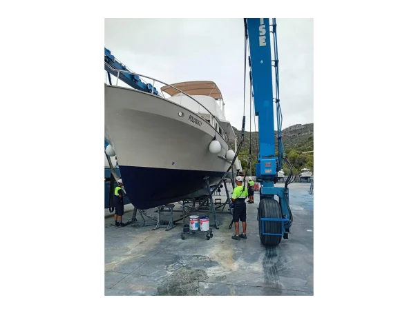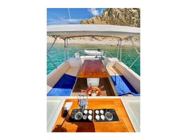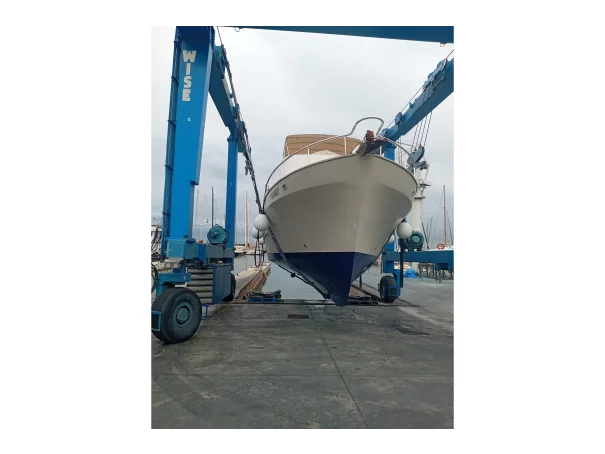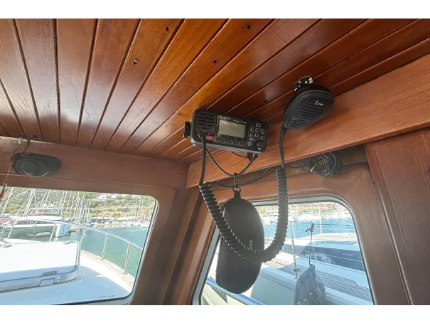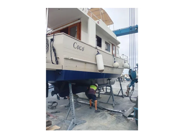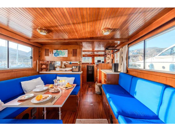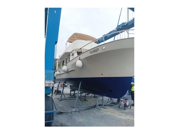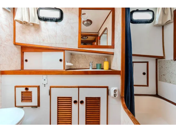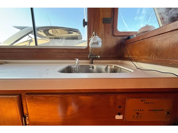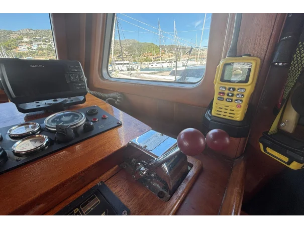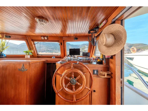 This boat is made of reinforced polyester, with grained sides and the hull above the waterline. The vessel's hull below the waterline was treated with antifouling. Vessel steering is possible from both the lower and upper rudder spaces; the cockpit is well protected, and the rudder space connection is enabled. The vessel's propulsion units are built-in LEHMAN FORD diesel engines with a combined power of 2 x 120 HP.