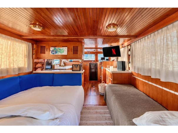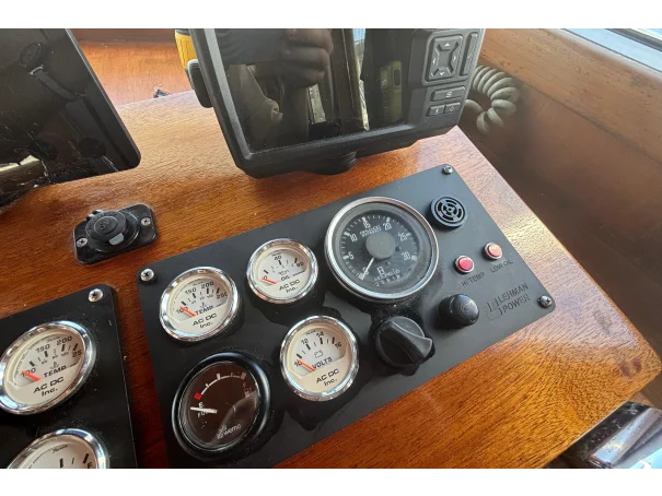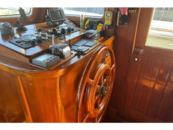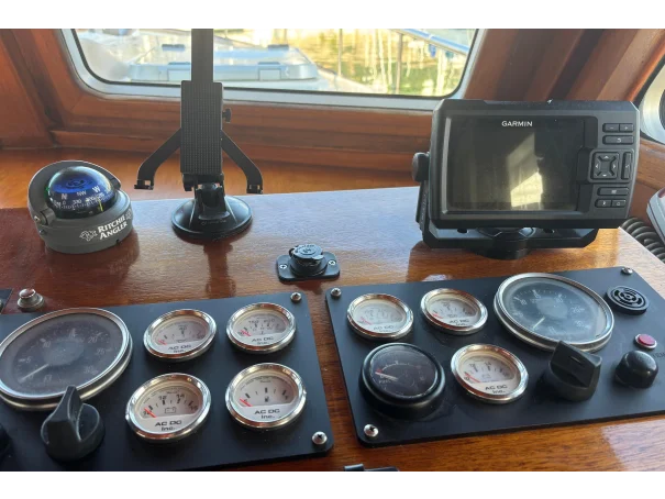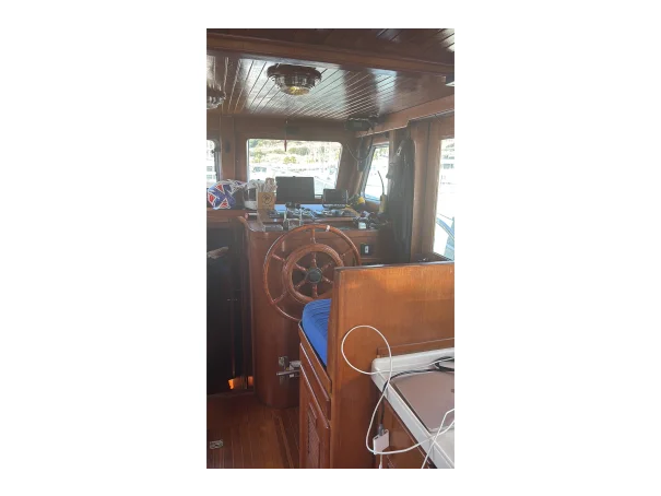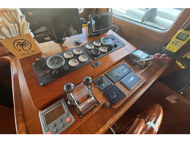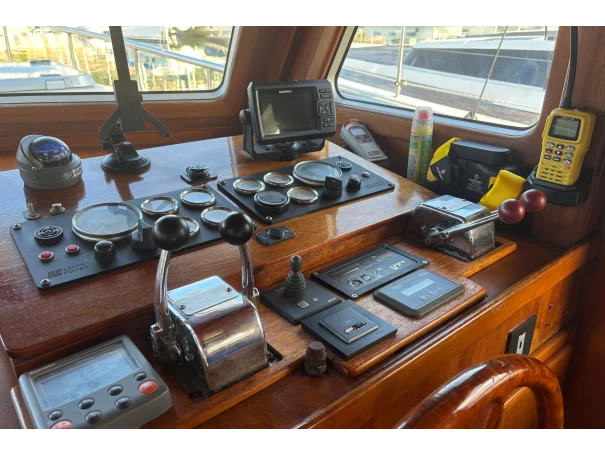 This unit stands out for a major 2015 refit that included a full renovation of the flybridge, a new teak deck, stainless-steel handrails, an upgraded galley, and refreshed interior varnishes. The result is a vessel that combines timeless trawler charm with modern comfort.
