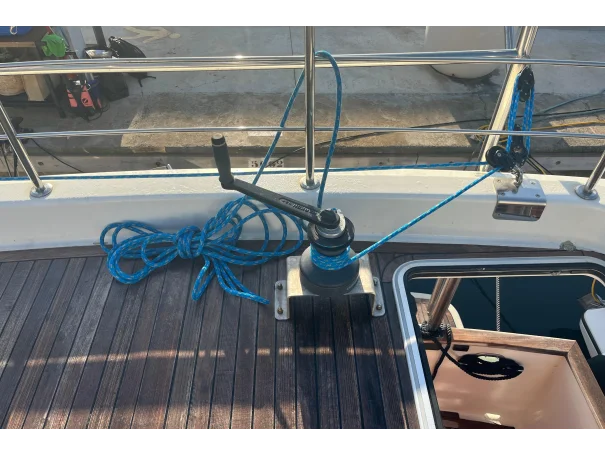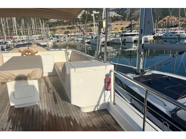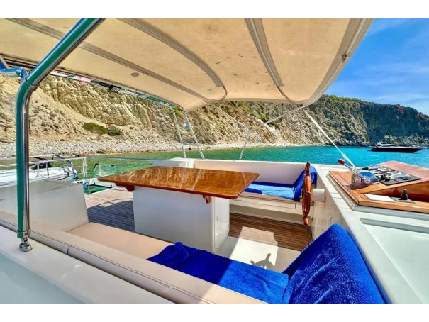 The interior layout includes two spacious double cabins, a large saloon with additional three berths (total 7), a fully equipped galley, and ample storage. Comfort on board is ensured by Webasto heating and air conditioning, an electric WC with holding tank, hot water, and a 6 kW Lombardini generator.