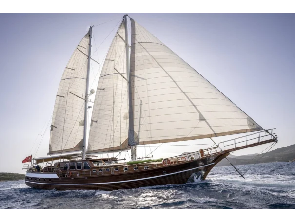 Powered by twin 450 HP Iveco engines, this gulet offers reliable cruising performance with an 11-knot cruising speed and a top speed of 12.5 knots. She is equipped with shaft drive propulsion, dual 33 kW generators and Simrad navigational systems. The vessel carries 6,000 litres of fuel, supported by two 220 L/h watermakers for extended autonomy. Traditional ketch rig configuration and wheel steering provide excellent handling and balanced sailing performance. Engine room is well-insulated and arranged for ease of access and maintenance.