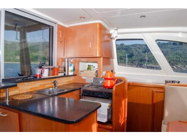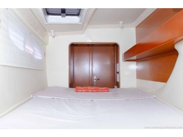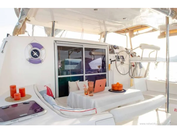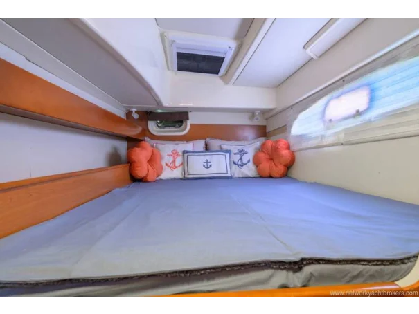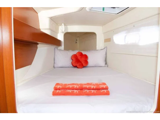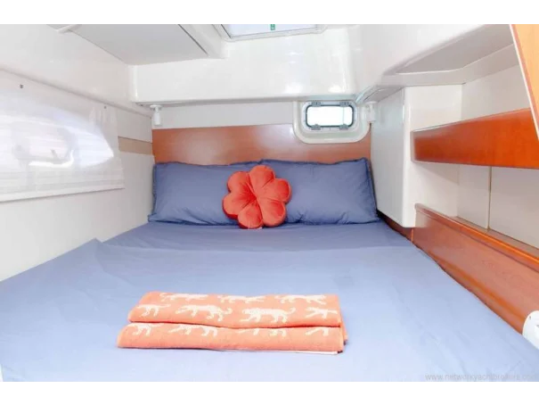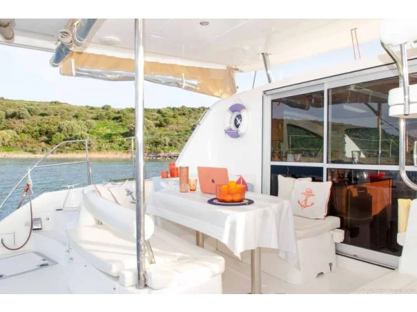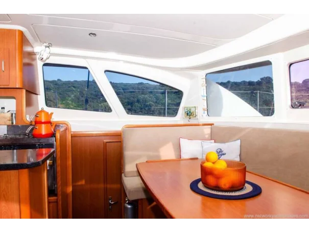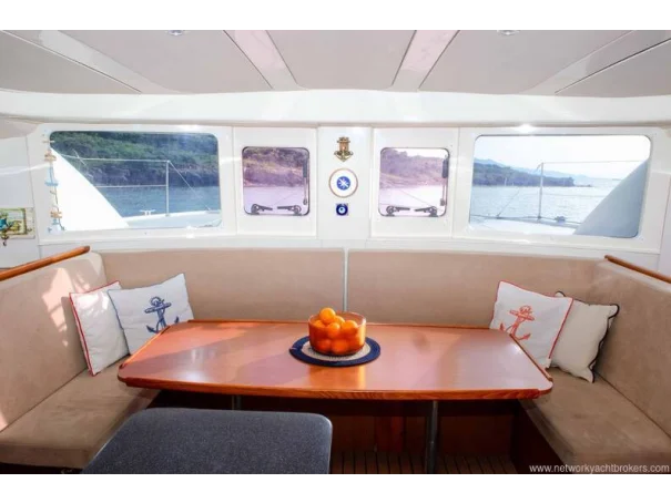 On deck, the yacht is fitted with mast and sails, electric windlass, anchor and chain, bimini top, sunbathing areas, swimming ladder and davits. Safety equipment includes life jackets, lifebuoys and fire-fighting equipment.