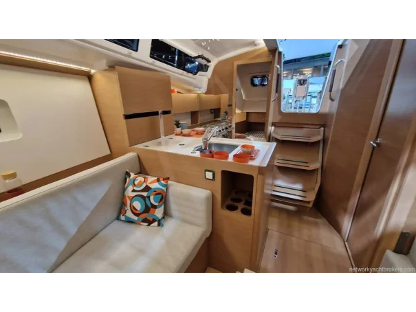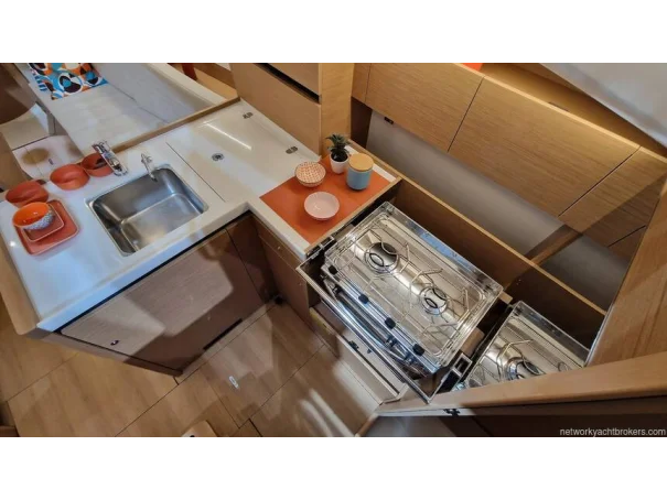 Galley: L-shaped to starboard with stainless steel sink, gimballed 2-burner stove, 100 L fridge with freezer compartment.