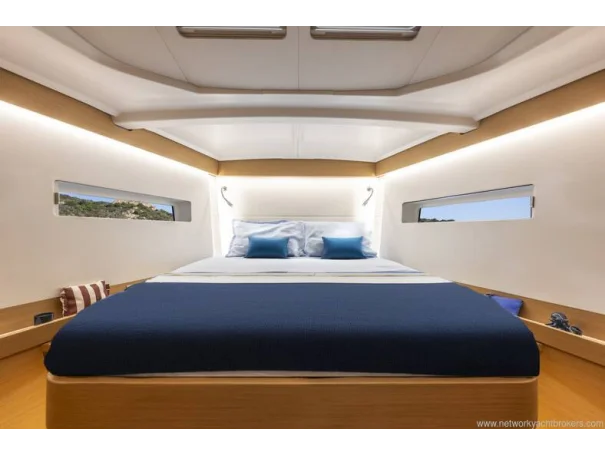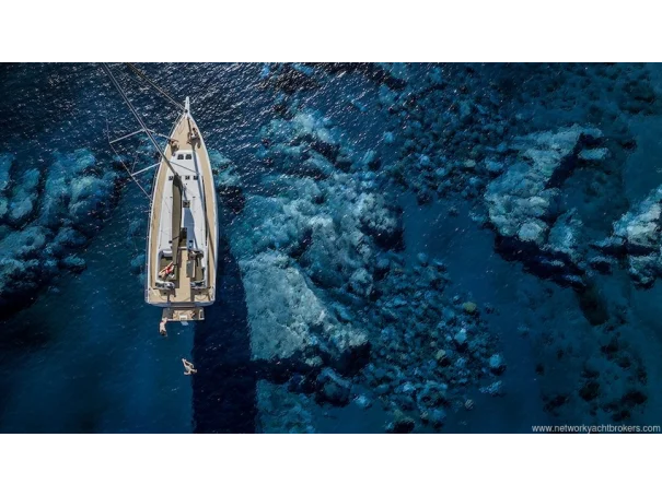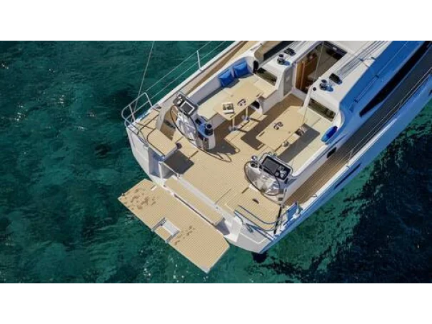 Her cockpit has been designed with both sailing and relaxation in mind, featuring twin composite steering wheelswooden cockpit tablesconvertible cockpit sunbedshigh-transparency sprayhood with LED lighting, and an electric transom drive providing seamless access to the water. Full mooring and anchoring kits complete a truly turn-key package.