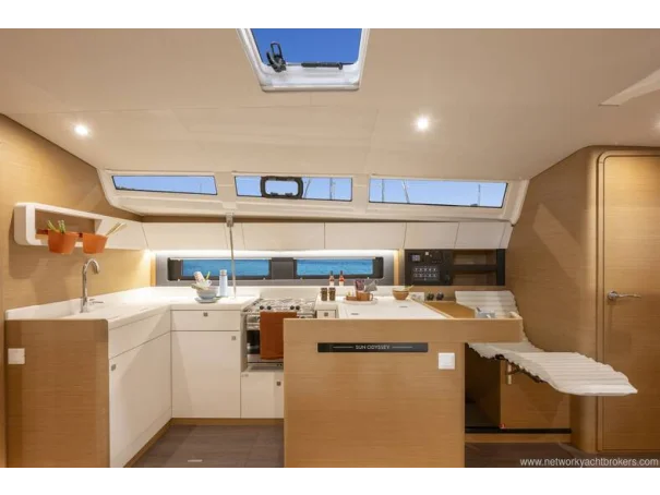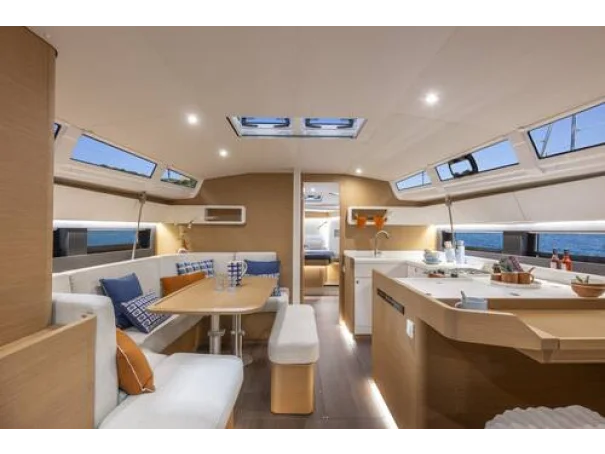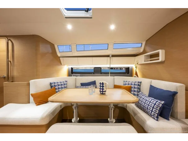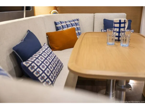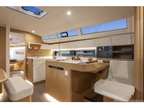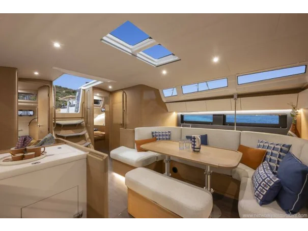 Below deck, the 3-cabin, 2-head layout is finished in grey cedar with dark oak laminate flooring, creating a bright, modern, and inviting interior. Jeanneau’s signature one-level interior with no door sillsleather-wrapped handrails, and large rectangular berths enhance both comfort and safety at sea. The saloon features a luxury electric telescopic table, premium upholstery, indirect LED lighting, and generous storage throughout.