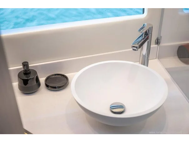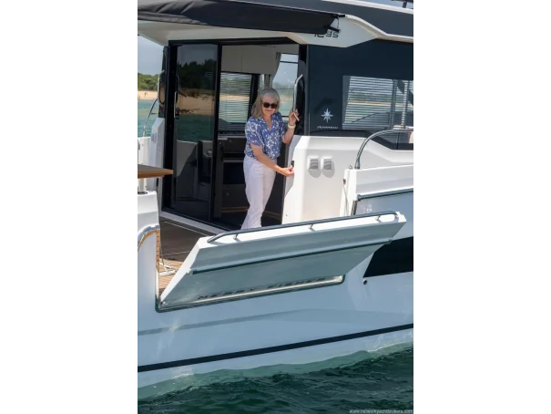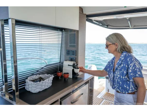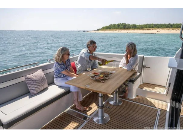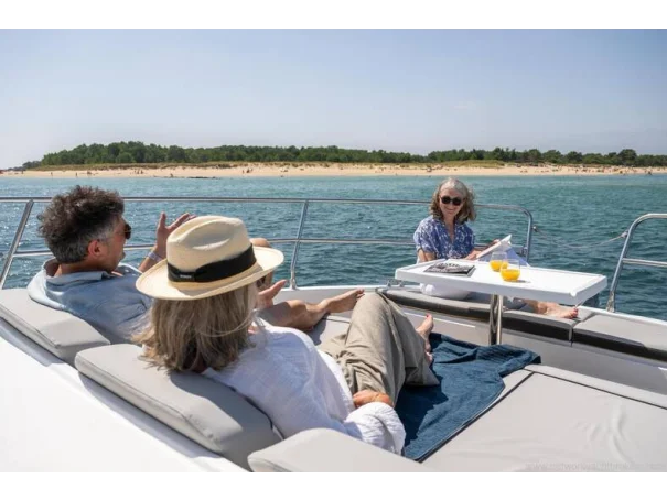 Mooring kit Anchoring kit Swim ladder for lateral terrace Storage rack on roof for paddle board Fibreglass aft cockpit table with telescopic legs for sun pad Twin drawer stainless steel fridge/freezer 144l