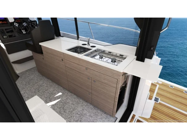 Including: - Electrical bow windlass - Cockpit shower (hot & cold water) - Ambiance LED lights (saloon & cabins) - LED lights in cockpit floor - LED lights in flybridge floor - Electrical trim tabs LENCO with double control (wheelhouse and fly) – UPGRADED to Auto Zipwakes - 220V water heater - Interior curtains - 2 rear cockpit worklights - 2 rod holders
