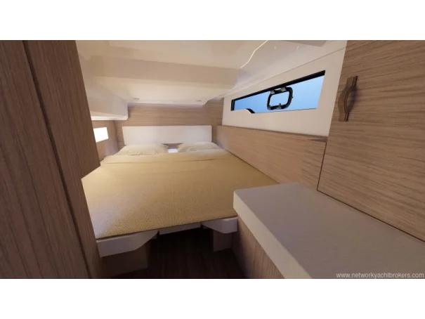 Forward owner’s cabin with a central double berth, storage lockers, reading lights, and direct access to the heads compartment