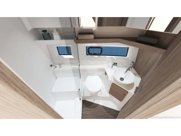Single heads compartment with marine toilet, washbasin, and separate shower area