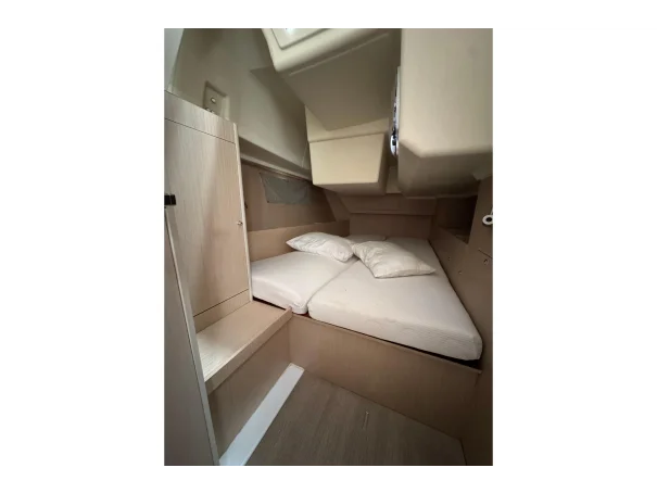 Aft Cabins: The two symmetrical aft cabins benefit most from the wide chine hull design, offering queen-sized berths with generous width, standing headroom, and excellent storage.