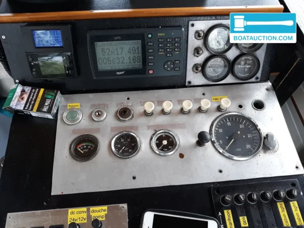 Sur le plan technique, le navire dispose d'un équipement de base comprenant notamment un compte-tours, un voltmètre et un système électrique de 24V. Deux batteries assurent l'alimentation électrique à bord, complétées par un panneau solaire pour une efficacité énergétique supplémentaire. Pour la navigation, un GPS et une radio VHF sont présents, ce qui facilite la navigation sur les grandes eaux intérieures. La sécurité est assurée par une bouée de sauvetage, un cockpit auto-videur et une pompe de cale manuelle.