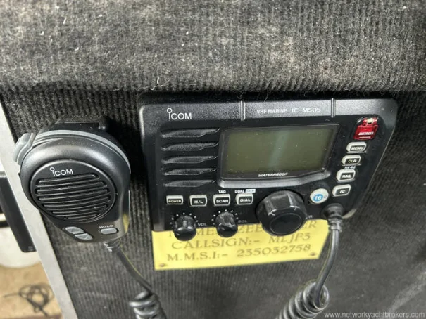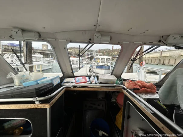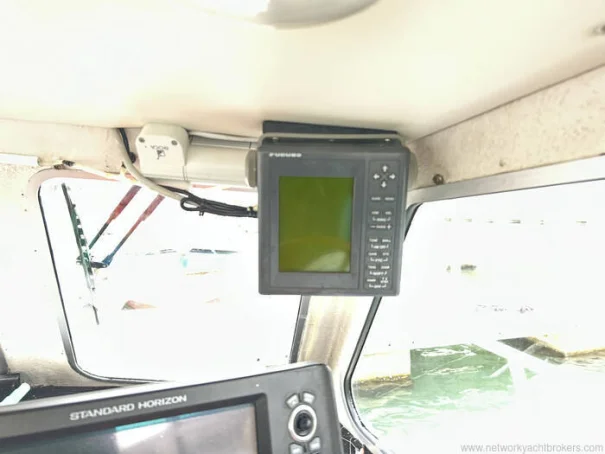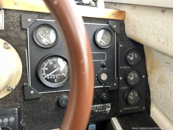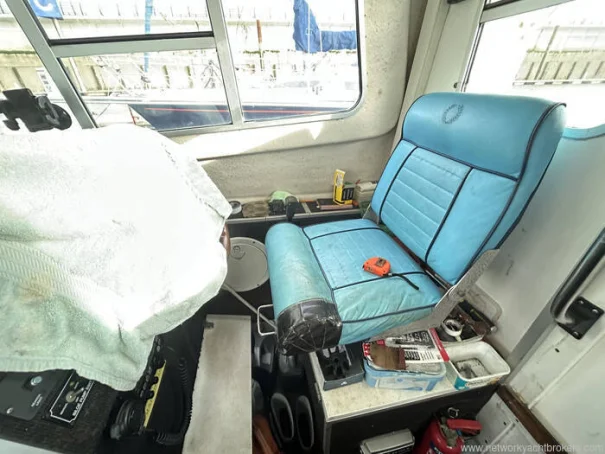 Aft of the V berth are two large storage lockers.  To Port is two single bench seats with an offset table. Opposite is the Helms seat with an array of navigation instruments and wheel steering. The vessel is fitted with an Eberspacher diesel cabin heating system.