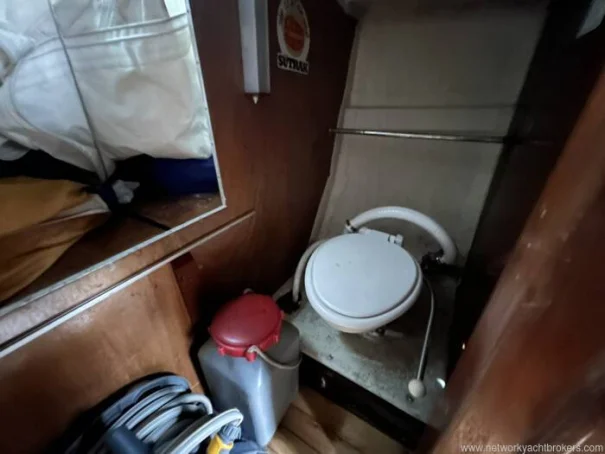 Opposite the galley to starboard is the enclosed heads compartment, fitted with a marine WC and washbasin, providing welcome privacy compared with many yachts of this size.