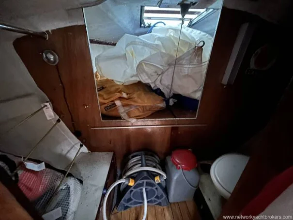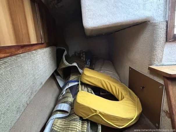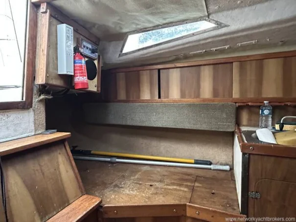 Forward is the V-berth cabin, which can be used as either two singles or infilled to form a generous double berth. Storage shelving is provided along the hull sides, with additional stowage beneath the berths, offering useful space for cruising gear.