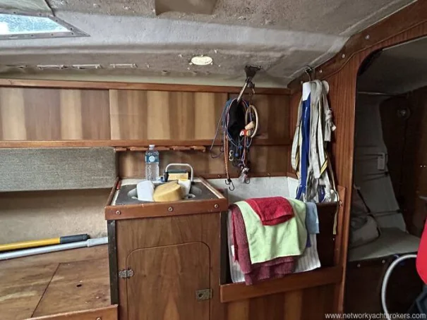 To port is the compact galley, typically fitted with a sink, cooker provision and storage for utensils and supplies — perfectly adequate for preparing simple meals aboard.