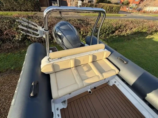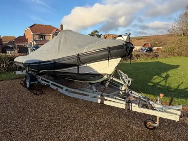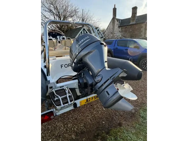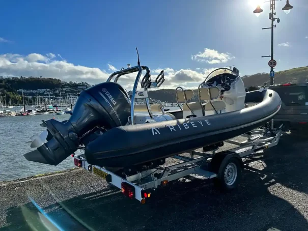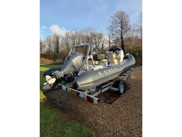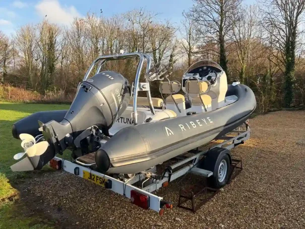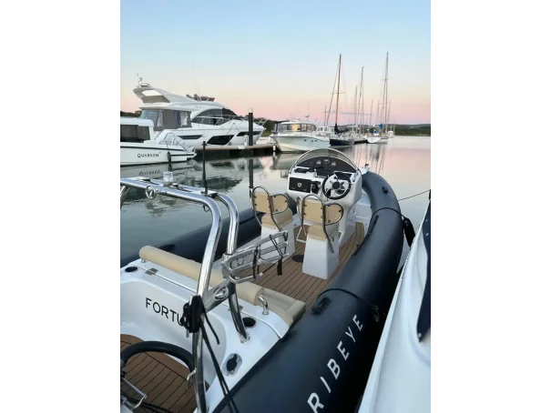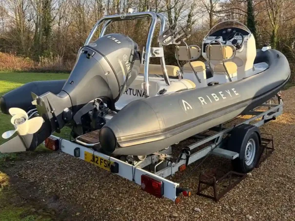 Fortuna is a 2023 Ribeye A600 with Yamaha 130hp with only 45 Hours on the clock! This nearly new Ribeye A600 is the ultimate all-rounder â perfect for thrilling days of water skiing or relaxed family outings. This is a stunning colour combination with the black tubes contrasting the cream seat covers. This boat combines performance with reliability. It comes fully equipped with a SBS roller trailer, Garmin chart plotter, Garmin VHF radio, and a Fusion audio system with high-quality speakers. The deck is illuminated with low-level blue LED lighting, enhancing its stylish, ready-to-go look. Designed for water sports, it includes an A-frame with tow eye, jockey seats, a boarding platform with ladder, Hypalon tubes, and Flexi-teak flooring. The Ribeye A600 stands out for its exceptional safety, strength, stability, speed, and comfort. There is a forward seat under which is the anchor and chain/rope and fenders. There are two ropes for mooring. This boat is ready to go straight to sea, everything you need is included. The trailer is in good condition and everything works and there is a prop bag too.