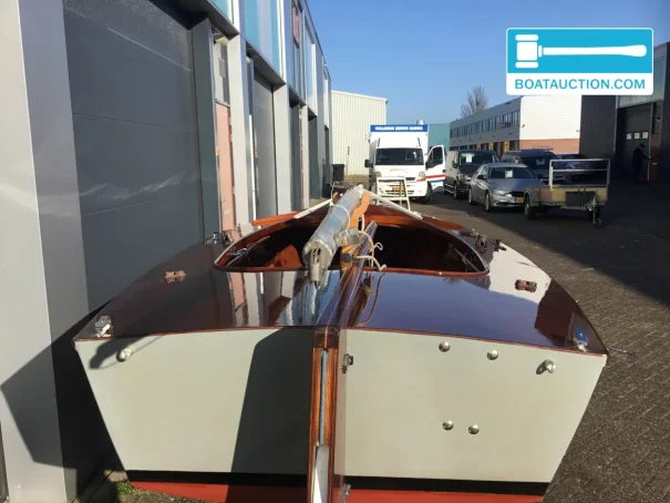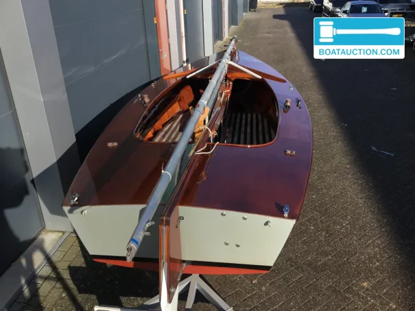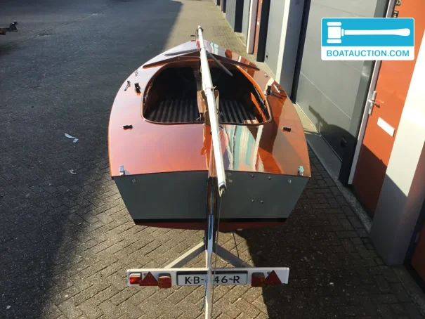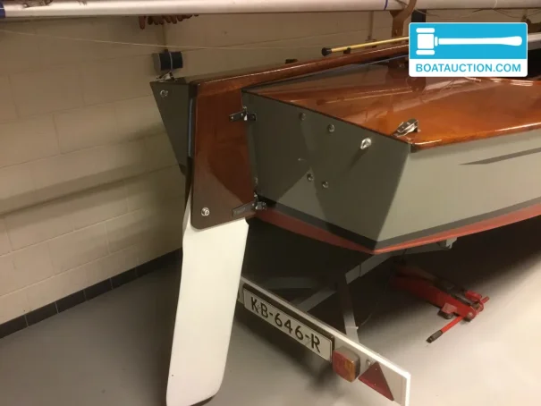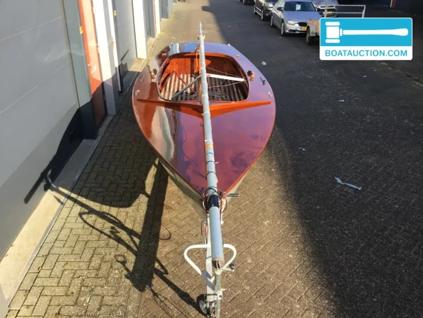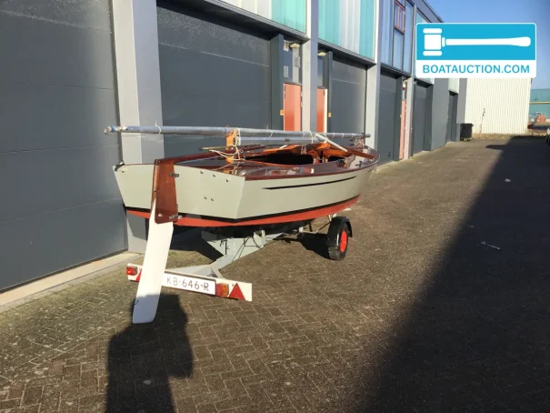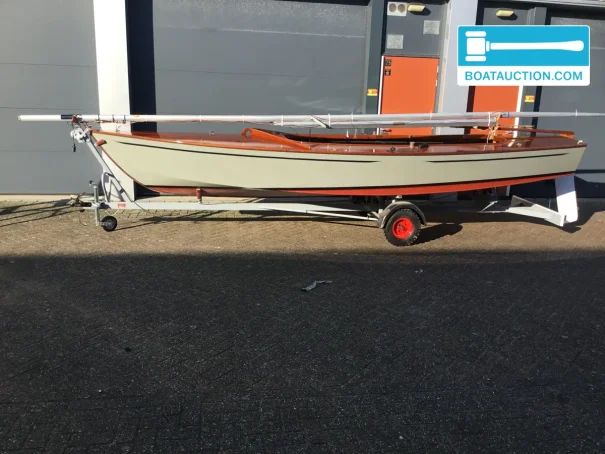 La coque est en bois et a été construite chez Van Wijk & Zonen. Le bois confère à ce voilier une allure chaleureuse et authentique, plus rare sur les bateaux modernes en polyester. Par ailleurs, le fond en V contribue à une bonne tenue de cap et à un caractère vivant, surtout sur les eaux intérieures où rafales et clapot court peuvent alterner. Le tirant d’eau est d’environ 0,20 mètre, ce qui rend le bateau intéressant pour les zones peu profondes et l’exploration d’endroits abrités. La hauteur de passage d’environ 7,00 mètres correspond au profil vélique d’un petit voilier sans cabine ou légèrement équipé, pensé avant tout pour une navigation active et une mise à l’eau rapide.