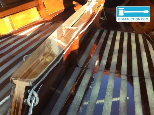 Selon le propriétaire, le bateau a été entièrement restauré après l’achat auprès du premier propriétaire. Le Spanker est resté stocké au sec pendant plus de vingt ans, puis a été remis en état. La restauration a en outre été documentée par des photos, et le propriétaire actuel peut expliquer l’entretien réalisé ainsi que le système de peinture utilisé. Pour les acheteurs potentiels, c’est un atout : vous obtenez non seulement un voilier classique en bois, mais aussi une vision claire des choix de matériaux et de finition.
