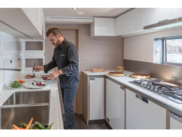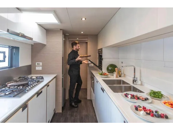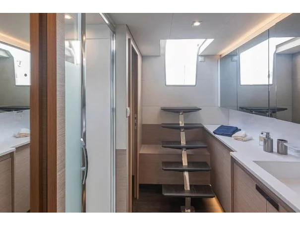 Below decks, five guest cabins and a dedicated crew cabin served by five heads and a crew head - make her a serious charter income opportunity as much as a private blue water home. This is a boat you live aboard, not merely sleep aboard.