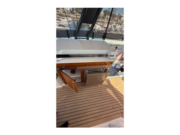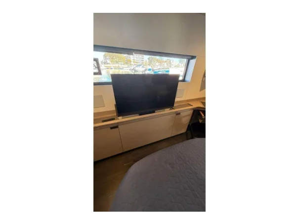 Twin Volvo D3 inboard engines delivering 150hp each push her to a hull speed of 12 knots, while her sail drive configuration and shallow 1.65m draft open up anchorages that deeper-drafted vessels can only admire from a distance. The fiberglass hull is engineered for stability and longevity, and her cruising range of 900km makes extended offshore passages genuinely achievable.