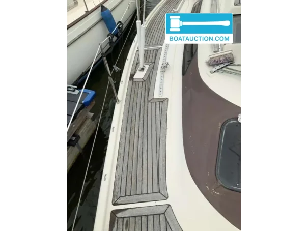 À l’extérieur, le bateau est aménagé pour un séjour confortable dans le cockpit, avec notamment une capote, une tente de cockpit, une table de cockpit et des coussins extérieurs. Les filières et l’échelle de bain rendent la vie sur le pont pratique, aussi bien en navigation que pour la baignade ou l’amarrage. Le pont en teck est présent et donne au bateau une allure classique, avec la remarque que ce pont en teck nécessite de l’attention. Pour le mouillage, il y a une ancre avec fixation sur ligne. Des pare-battages et des amarres sont également présents, rendant le bateau immédiatement utilisable pour une place au port et les escales. Une télévision est aussi à bord.