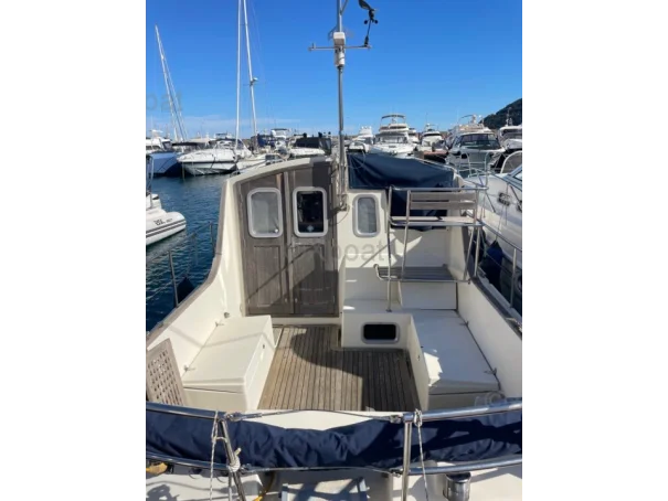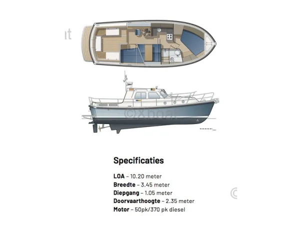 Grâce à ses lignes intemporelles et à la qualité de sa construction et de ses matériaux, le Patrol 1020 est sans aucun doute un investissement judicieux pour des plaisirs nautiques sereins et en toute sécurité. Le soin apporté aux finitions, jusque dans les moindres détails, des mains courantes au mât radar rétractable, souligne sa fonction de yacht à moteur à la fois fonctionnel et élégant. Un grand croiseur familial, doté d'une cabine propriétaire à l'avant, de toilettes et d'une douche, d'une cuisine luxueuse avec coin salon, de deux couchettes fixes supplémentaires et de nombreux rangements astucieux. Homologué CE-B pour la navigation en mer. À vitesse élevée, le bateau glisse en douceur. Même par mer agitée, vous pouvez maintenir les gaz à plein régime avec un minimum d'éclaboussures. Les dernières avancées en matière d'hydrodynamique garantissent un comportement stable en mer agitée et une consommation de carburant optimisée. L'ONJ 1020 se révèle pleinement depuis l'eau : un franc-bord modéré, une étrave robuste et des passavants larges – un design à la fois fonctionnel et discret. Le haut balcon continu, associé aux larges passavants, offre une agréable sensation de sécurité.