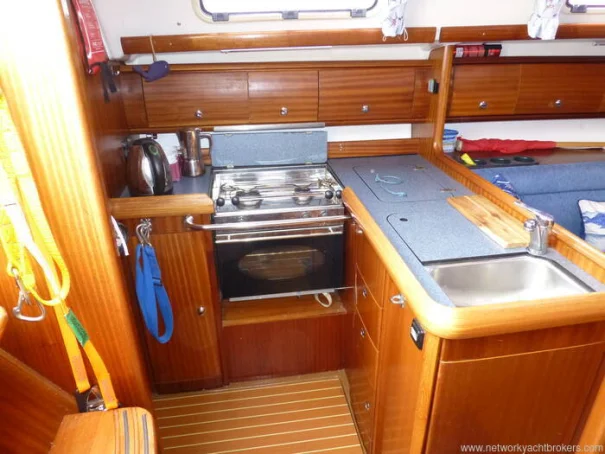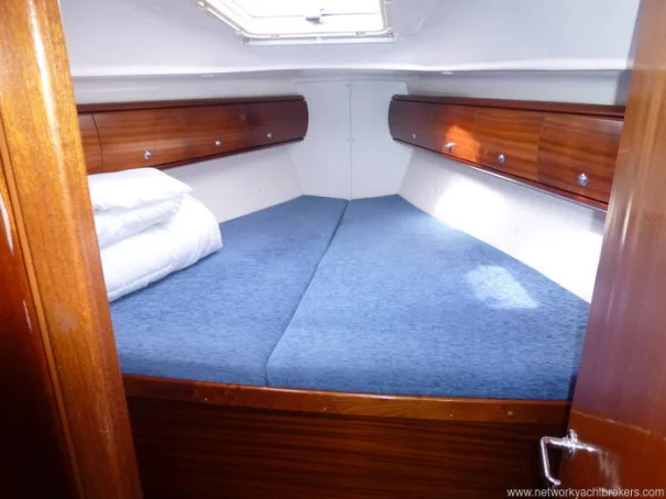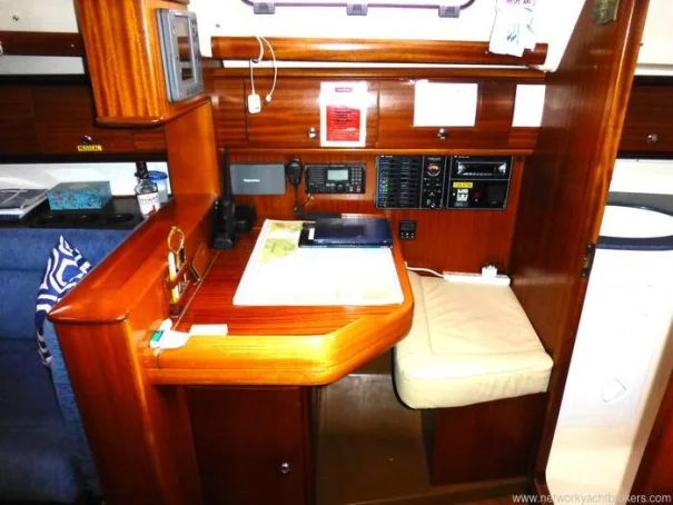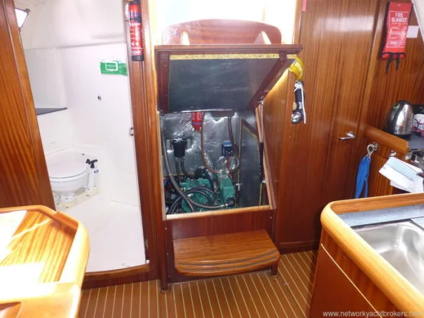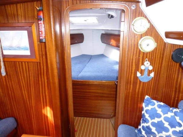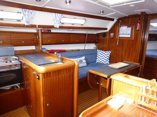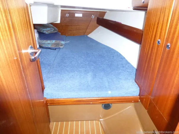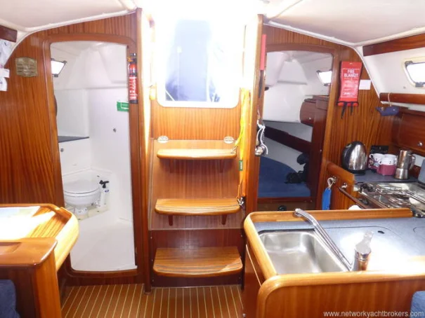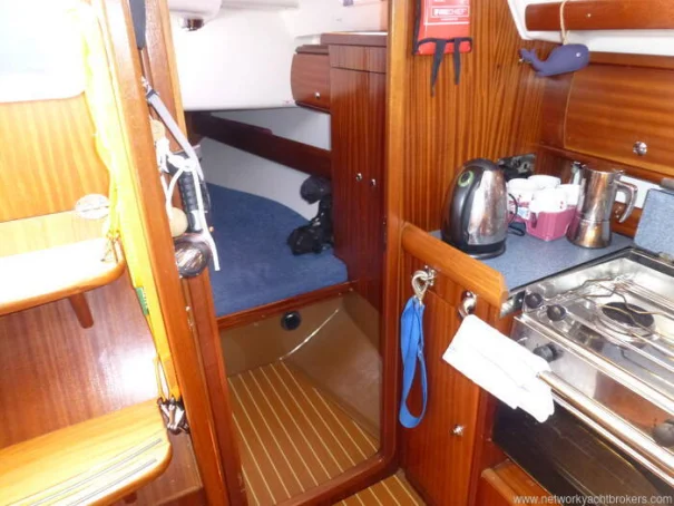 L shaped galley to port, chart table to starboard with a seat, under seat storage and opening portlight. Port door to the aft cabin with double berth, storage, hanging locker, opening portlights to cockpit and side deck, access panel to engine.