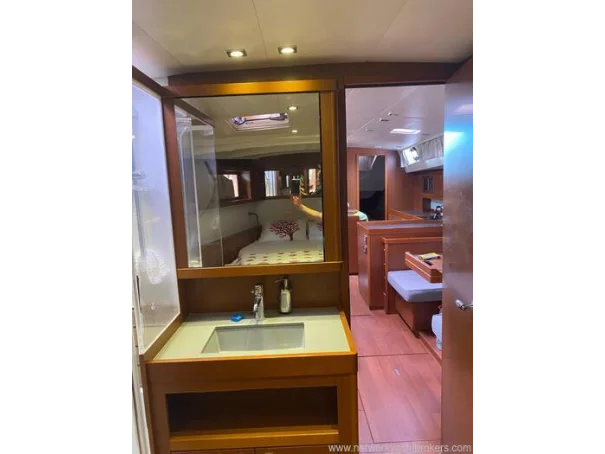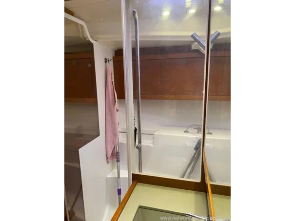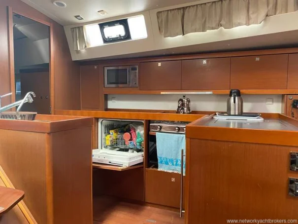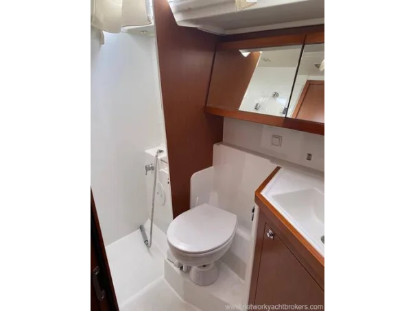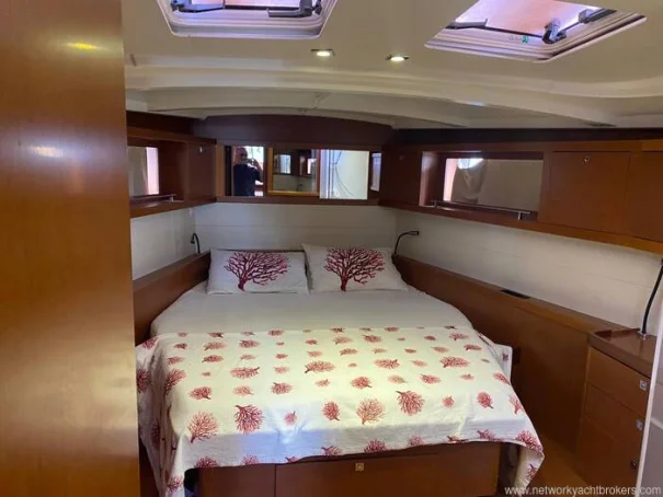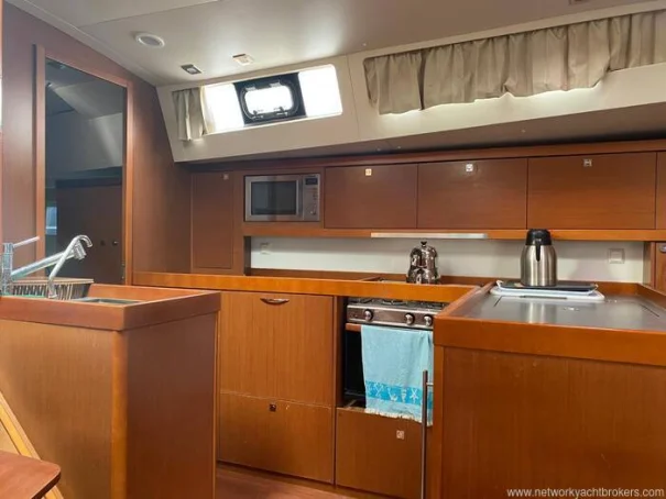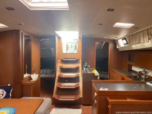 The yacht features a sloop rig with furling mainsail and furling genoa, providing ease of handling and efficient sailing performance. All sail handling systems are designed for short-handed cruising.