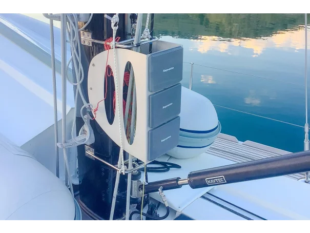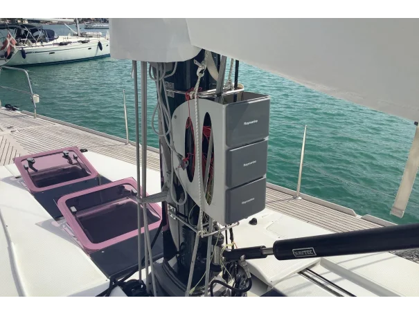 Major works carried out under the current ownership include rod standing and running rigging replacement in 2020, a Raymarine Axiom chartplotter installation in 2023, radar upgrade in 2020, wind instrument upgrade in 2025, skin fittings replacement in 2023, and comprehensive domestic battery replacement between 2020 and 2024. The engine was fully serviced in March 2025 alongside antifouling and anode renewal. A maintenance summary from Ionian Boat Assistance is available on request.