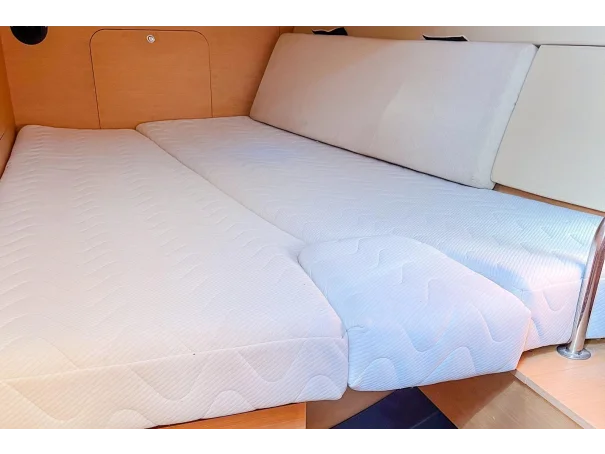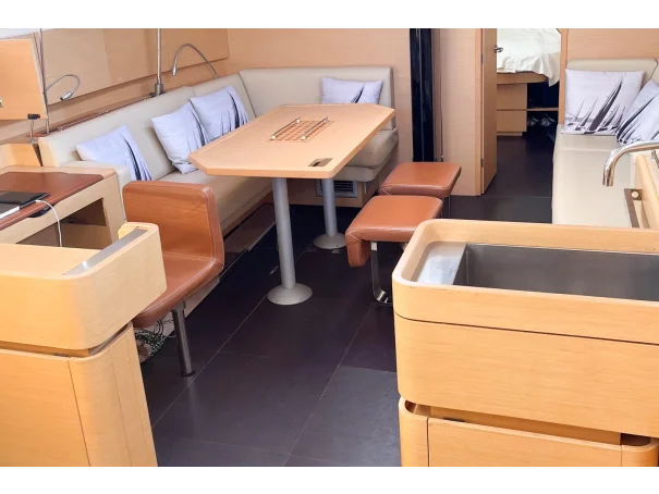 Timoa III offers comfortable three-cabin accommodation suited to a crew of four to six. The interior is finished in light oak with cream upholstery (Astra Chanvre), creating a light and welcoming environment. Headroom throughout is approximately 2m.