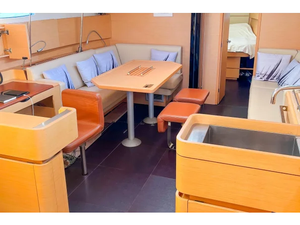 The layout comprises three cabins with berths for four to six, two heads compartments each with shower, a dedicated navigation station, and a well-positioned galley. The saloon features a central table and ample seating.