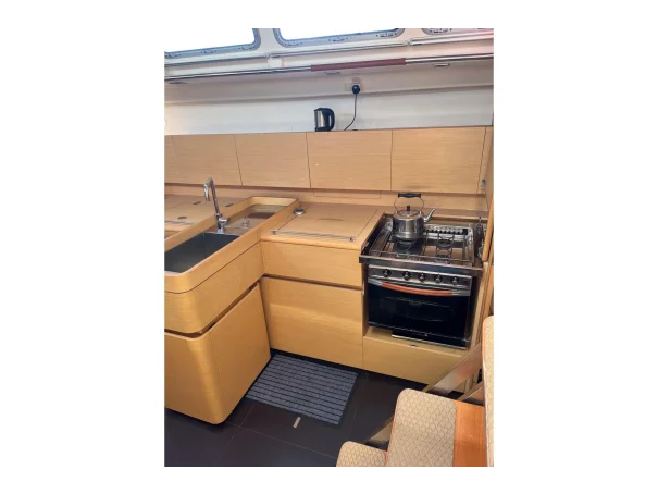 The galley is equipped with a 4-burner hob, oven, and grill, a galley sink with pressurised hot and cold water, and a refrigerator with cool box. Domestic hot water is supplied via the engine calorifier. Twin air conditioning units are fitted throughout. Both heads are fitted with quiet-flush electric toilets. Entertainment includes a Sony stereo system (2020) and a television with DVD player (2020).