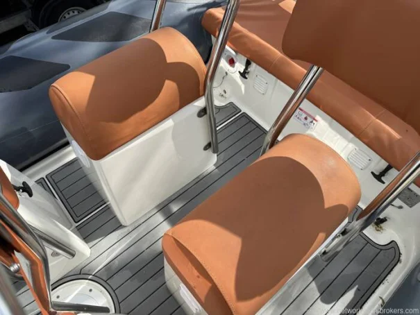 This Navigator 610, has upgraded military grey ORCA Hypalon tubes; white GRP hull; upgraded Suzuki DF115HP ATL engine; 4 jockey seats and rear bench seat with cushioned back rest in orange luxury weatherproof Silver Tex fabric upholstery; hydraulic steering and Towable S/S polished A-frame with Nav Lights.