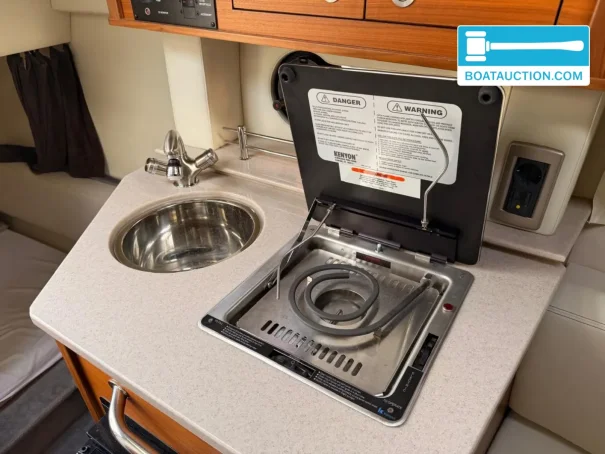 Pour ceux qui aiment naviguer en autonomie sans devoir manger à terre chaque jour, la cuisine est équipée notamment d’un micro-ondes et d’un four, complétés par des matelas adaptés à l’usage « nuit à bord » de ce cruiser. Le réservoir d’eau a une capacité d’environ 106 litres, ce qui est pratique pour plusieurs jours d’utilisation. Les sanitaires sont conçus de manière à ce que l’évacuation des toilettes ne se fasse pas directement en eau libre, conformément aux règles et attentes en vigueur dans de nombreuses zones de navigation et marinas.