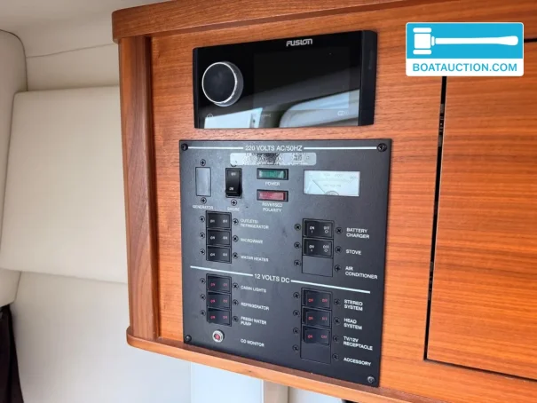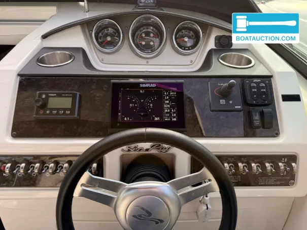Le poste de pilotage du Sea Ray 265 Sundancer est conçu pour offrir une bonne visibilité panoramique et une ergonomie de commande logique, contribuant à une navigation détendue lors des sorties à la journée comme des croisières plus longues. À bord, un pack électronique GPS Simrad est présent, complété par GPS, sondeur (fishfinder) et loch/indicateur de vitesse. Cela permet de planifier facilement les itinéraires, de surveiller la vitesse et la profondeur, et d’explorer de nouvelles zones de navigation en toute confiance. Pour le divertissement, une stéréo Fusion est installée, afin que le cockpit reste un lieu agréable pour se retrouver, au mouillage comme au port.