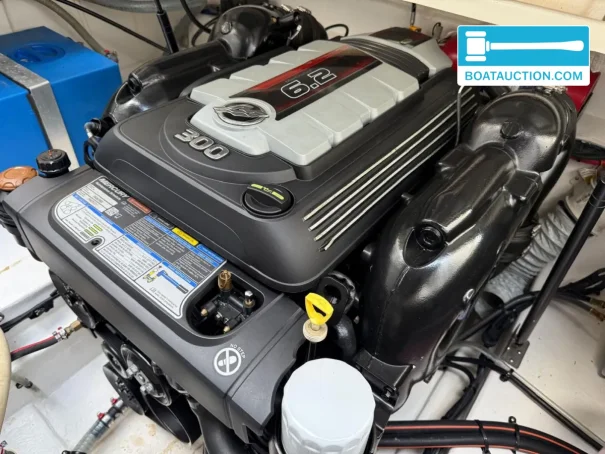 Ce Sea Ray 265 Sundancer est équipé d’un moteur essence MerCruiser 6.2L MPI de 300 ch (année 2020) totalisant environ 150 heures de fonctionnement. Cette combinaison est réputée pour sa réponse immédiate à l’accélération et son comportement dynamique, fidèle à l’ADN sportif de la gamme Sundancer. La coque à V profond contribue à une bonne tenue de cap et à un amortissement agréable dans la vague, particulièrement appréciable en eaux ouvertes et en zones côtières. Pour ajuster l’assiette selon la charge et les conditions, le bateau dispose de flaps, permettant d’atteindre la vitesse de croisière de manière plus efficace et confortable. Au port et lors des manœuvres d’accostage, le propulseur d’étrave électrique facilite les déplacements contrôlés, même par vent ou avec un équipage réduit.