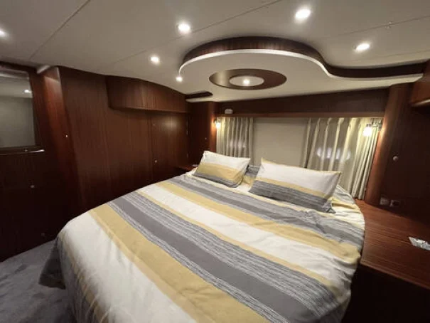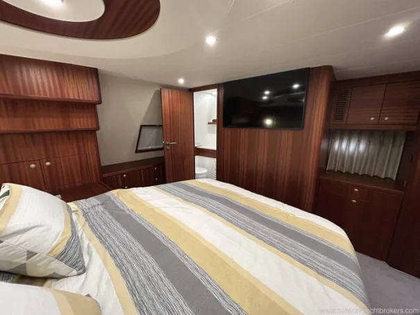 The spacious owner’s cabin is located aft in the stern and offers a luxurious retreat. A large island double berth sits centrally across the beam of the boat, with generous storage provided beneath and in surrounding lockers. It has its own TV screen . The cabin is beautifully finished with high-quality joinery, soft lighting, and excellent headroom. Natural light floods in through overhead hatches and portlights, enhancing the sense of space. The owners suite has a dedicated air conditioning unit to make for a good night's sleep on those warmer nights. The en-suite heads compartment includes a separate shower stall, electric toilet, and stylish washbasin, offering privacy and convenience.