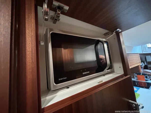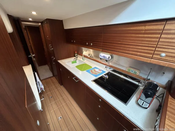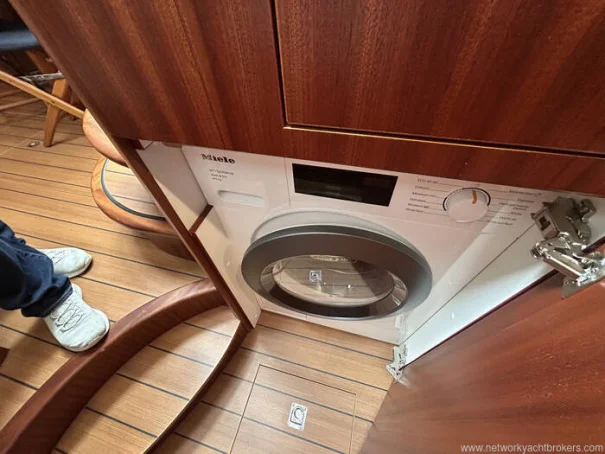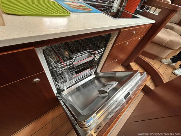 Steps lead down to the lower deck, where the galley is located aft and to port. This is a fully equipped, domestic-style space featuring ample worktop area, stainless steel sink, refrigerator, freezer, induction hob, and combination microwave/oven, Mielle washing/dryer machine and BOSH dishwasher. Extensive storage is provided through a combination of cupboards and drawers, making it ideal for extended time aboard.