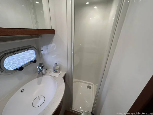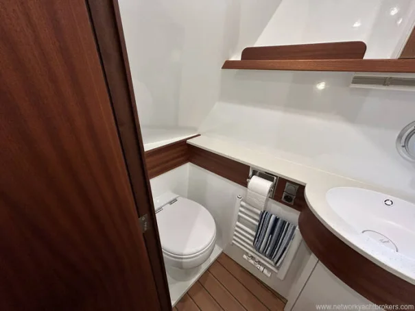 Aft of the guest cabin is the day heads compartment, finished to a high standard and equipped with a marine toilet with holding tank, washbasin, and separate shower area. Thoughtful design ensures ease of use without compromising on comfort.