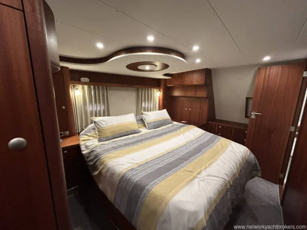 The accommodation layout is both versatile and spacious, featuring a desirable three-cabin configuration. The full-beam aft stateroom provides a private and comfortable owner’s retreat, while two additional guest cabins forward offer generous accommodation for family and friends. The interior is finished to an exceptional standard, with high-quality joinery, premium materials, and a warm, inviting atmosphere throughout.