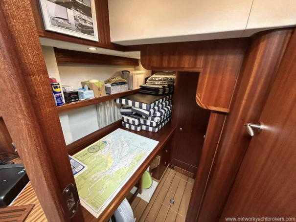 Aft of the saloon and to starboard is a side cabin that acts as a storage room with side access to the engine or as an additional single berth with LED lighting and a wardrobe.