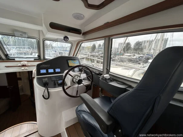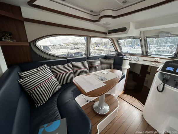 Accessed from the sheltered cockpit, the raised pilothouse saloon forms the social heart of the vessel. This bright and airy space offers excellent all-around visibility through large panoramic windows, creating a strong connection with the surroundings. To port, a comfortable U-shaped settee surrounds a beautifully finished dining table, providing ample seating for entertaining guests. Opposite, the well-appointed helm station features a fully adjustable helm seat and ergonomically arranged controls, allowing for relaxed cruising in all conditions. All windows have internal blinds, and the windscreen has external covers. The pilothouse also has its own wine fridge as well as an underfloor heating.