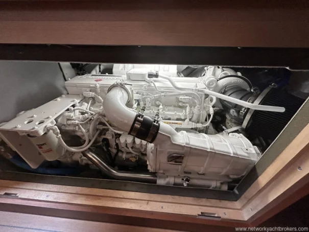 This Elling E4 has a single Cummins 8.3 6-cylinder 600HP diesel engine with an Aquadrive for low noise and vibration, and a stainless steel drive shaft with a water-injected bearing to a 4-blade prop. The engine has indirect cooling via a heat exchanger. The engine has completed a total of 310 hours as of 1st April 2026. The engine will be serviced in April 2026 by Cummins. There is a 1500-litre steel fuel tank knots. This Elling E4 will cruise at 10 Knots and has a maximum speed of 15 knots. To make handling easy, this boat is fitted with both bow and stern thrusters and also has a Magnus Master 1 Rotorsystem for 90% reduction of the roll movement of the ship. It has a 4KVA generator that has been used for a total of 19 hours