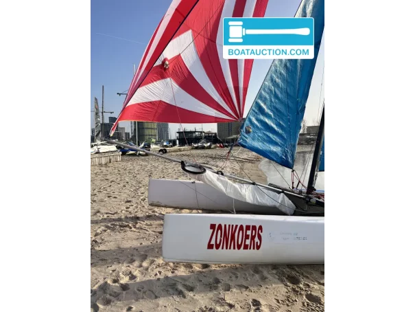 Elle est construite en polyester et mesure 5,70 mètres de long pour 2,44 mètres de large, avec un faible tirant d’eau d’environ 20 centimètres. Cela la rend intéressante pour ceux qui aiment naviguer dans des zones peu profondes, comme la mer des Wadden ou les lacs frisons. Grâce à sa conception de catamaran sportif avec double commande et doubles safrans, elle offre des sensations vives et réagit rapidement aux réglages et aux actions à la barre. La direction est de type joystick, un système apprécié par de nombreux catamaranistes pour son ressenti très direct.