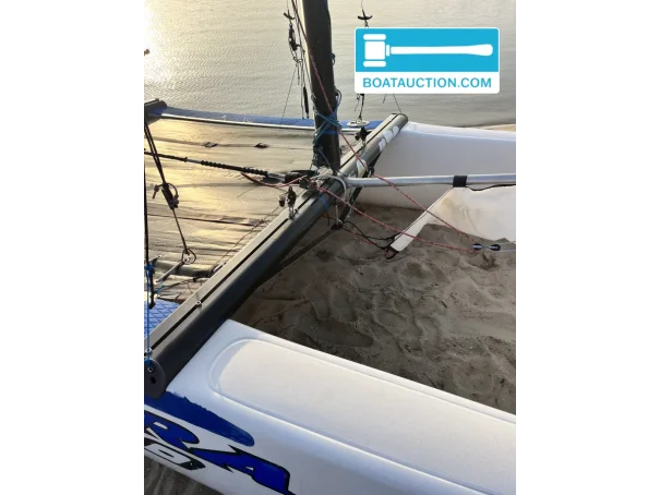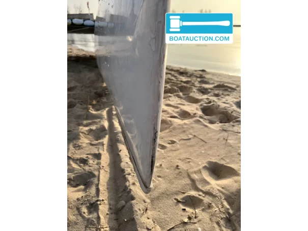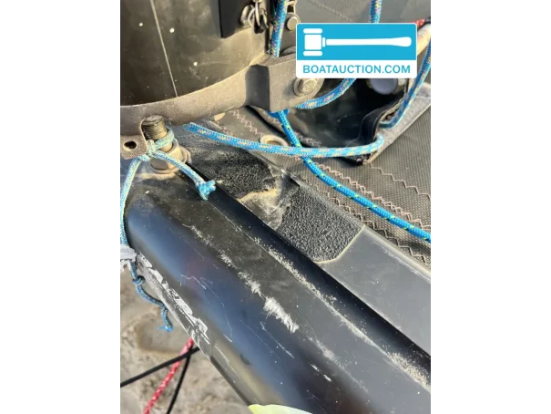 Elle est en état correct et présente des traces d’utilisation visibles, ce qui correspond à un bateau ayant beaucoup navigué et ayant aussi servi à progresser en catamaran. Il y a eu un léger choc à l’étrave ; celui-ci a été réparé professionnellement. On note également une petite bosse esthétique sur la poutre avant, à côté du pied de mât, sans impact sur la navigation. Les lames de safran présentent quelques marques dans la couche de protection, tandis que le noyau est intact. Ces points sont pertinents pour ceux qui recherchent de la transparence lors d’une vente aux enchères de catamaran et souhaitent savoir à quoi s’attendre.