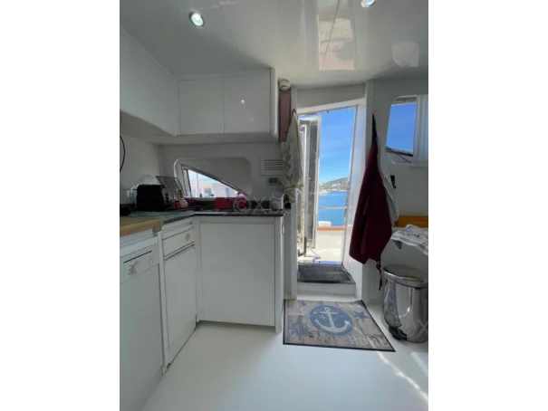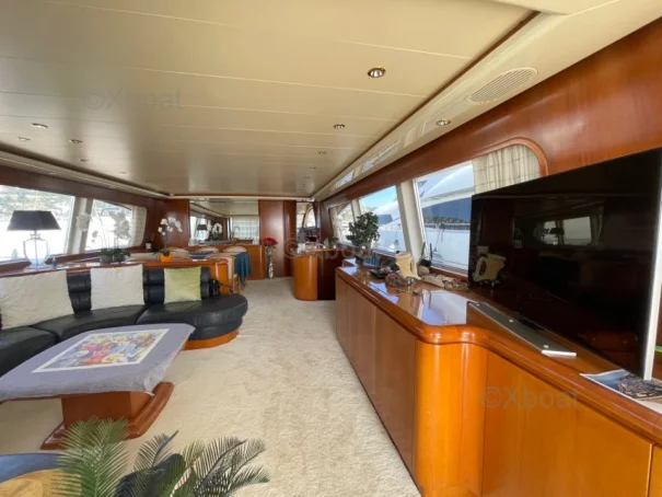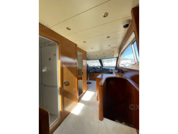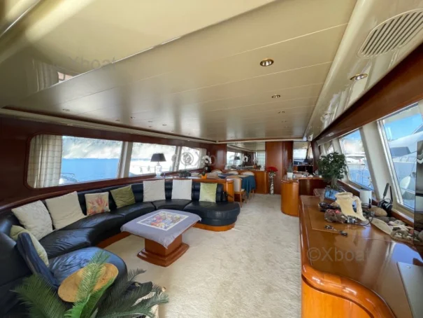 Le salon est partagé en deux espaces : un réservé à un large canapé et l'autre à la table conviviale pour les déjeuners et diners. La timonerie occupe un bel espace qui regroupe toutes les commandes et les tableaux de contrôles. Sur ce bateau et il est probablement le seul à en être équipé, vous découvrirez un très ingénieux système de contrôle d'absolument tous les systèmes du bord : contrôle des lumières, des caméras, des alarmes, du dispositif de déclenchement des pompes de cales, du parc de batteries dans sa totalité (services, moteurs et groupes), déclenchement des clims et des générateurs, tout ces systèmes et équipements opérables et contrôlables depuis un smart phone. C'est une parfaite réussie de l'intégration de systèmes électriques et électroniques de domotique et de navigation dans une seule application programmable et gérable à distance.