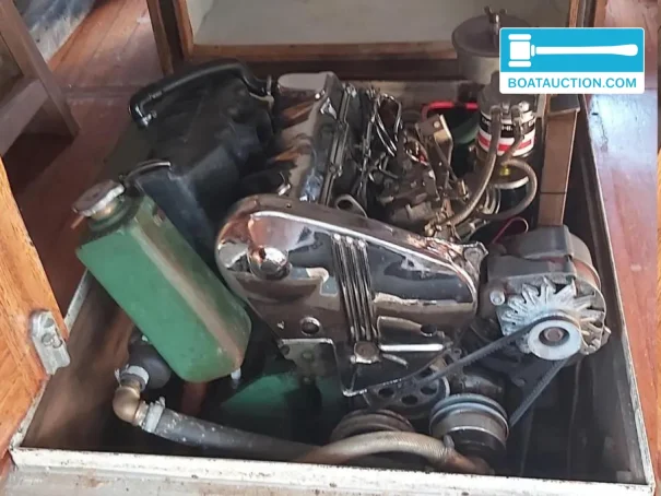 Elle est propulsée par un moteur inboard diesel Volkswagen de 75 ch datant de 1996, provenant d’une Volkswagen Jetta. Le moteur fonctionne et démarre électriquement. À bord, des instruments de contrôle sont présents, tels qu’un manomètre de pression d’huile et une jauge de température, ce qui est appréciable pour surveiller l’état du moteur en navigation. La vitesse de croisière est d’environ 9 km/h et la vitesse maximale d’environ 11 km/h, ce qui convient à des sorties détendues sur canaux, fossés, lacs et rivières. La pompe diesel a été entièrement révisée et une nouvelle courroie trapézoïdale a été installée. Le relais du démarreur et la batterie de démarrage ont également été remplacés l’an dernier. Cela la rend intéressante pour les acheteurs à la recherche d’un bakdekker en acier avec diesel inboard, tout en accordant de l’importance à une base pratique pour naviguer.