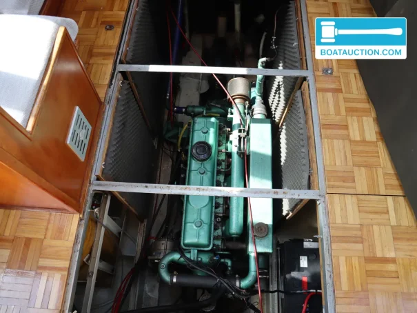 Il est propulsé par un moteur diesel DAF 615 de 105 ch, année 1986, démarrage électrique, et équipé d’instruments tels qu’un compte-tours, un indicateur de température, un manomètre de pression d’huile et une jauge de carburant. La vitesse de croisière est d’environ 12 km/h et la vitesse maximale d’environ 16 km/h, en accord avec le caractère d’un trawler : une navigation détendue avec une sensation de solidité. La consommation indiquée est d’environ 6 litres par heure, et avec un réservoir diesel d’environ 600 litres, son autonomie est intéressante pour de longues croisières sur les voies intérieures néerlandaises. Pour les manœuvres dans les ports et passages étroits, il est équipé d’un propulseur d’étrave électrique et d’un propulseur de poupe, ce qui facilite nettement l’accostage et les demi-tours.