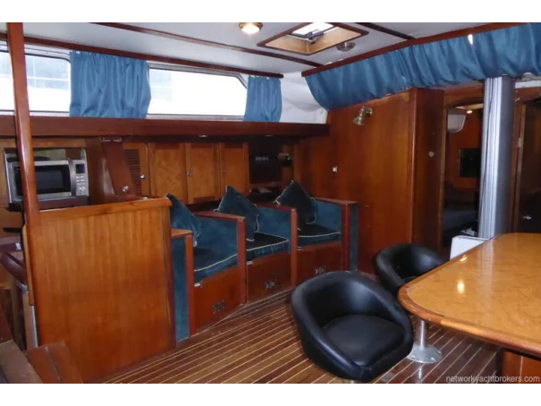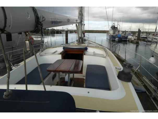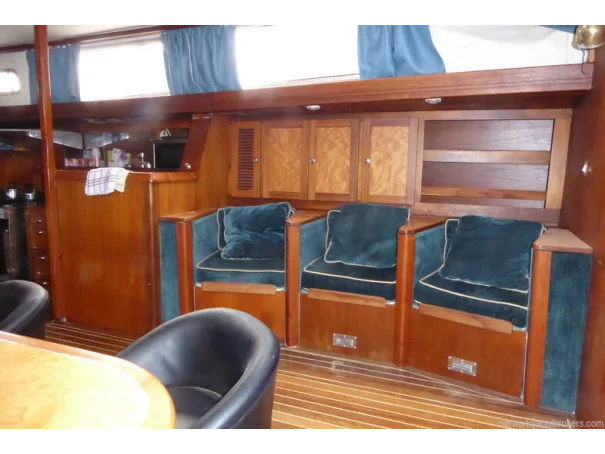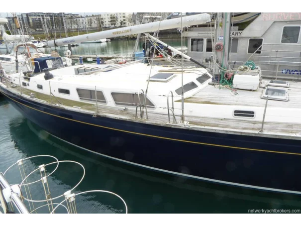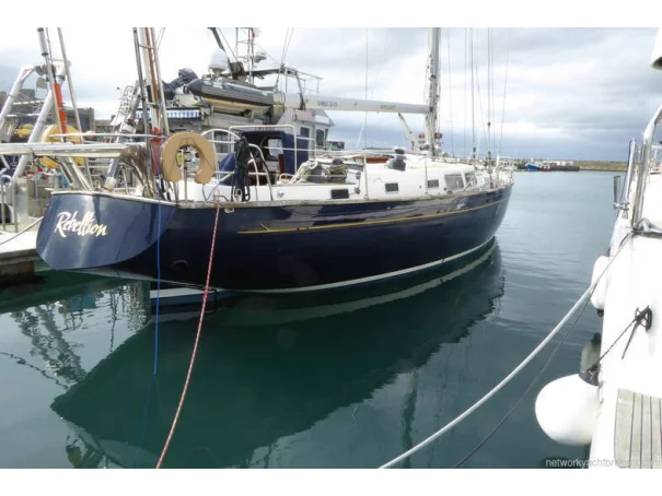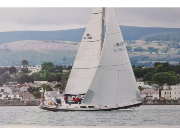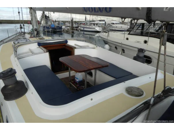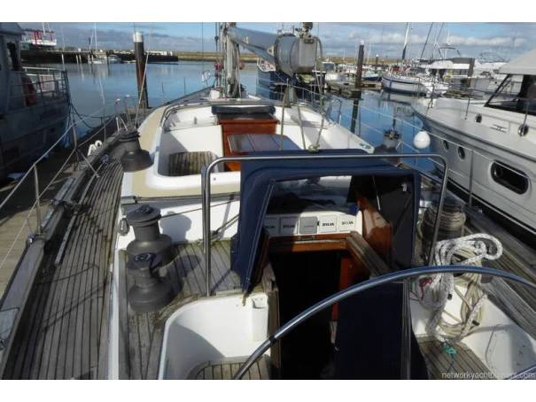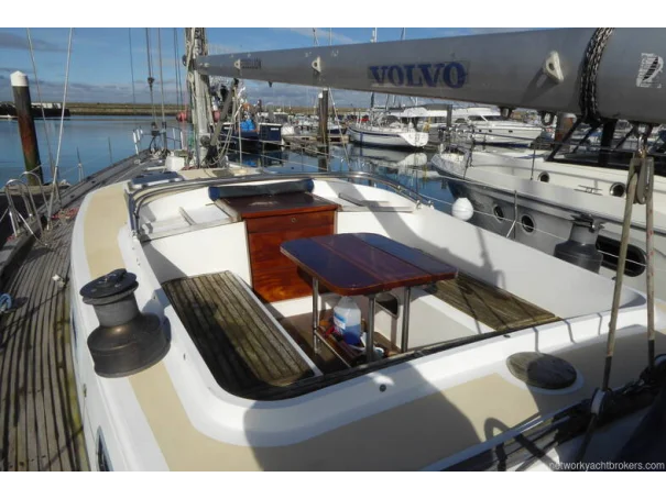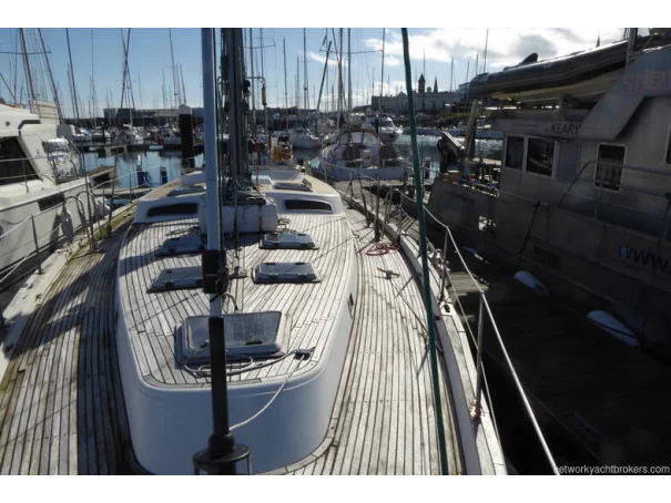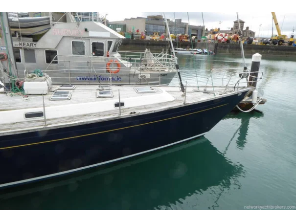 A sturdy 58 foot cruising yacht with bermudan sloop cutter rig, two cockpits, spacious saloon with armchairs, eight berths - 3 X double & 2 X single) three heads, linear galley and all powered by Perkins 6 cylinder diesel. Hull, coachroof and engine install by Colvic. Fit out by JMS Yachts. This yacht has been in one ownership since new and now seeks new adventure. While a capable blue water cruising yacht also has charter potential. Viewing by appointment at Dun Laoghaire. Accommodation : Teak decks with two cockpits, aft for helm. Below large spacious bright saloon - access by forward companionway. Large saloon table to starboard and two swivel seats on centre line. 3 bucket arm chairs to port with bar and storage. Galley to port side with 2 X deep stainless sinks with plate storage above. 24v fridge, 220V fridge, gimballed gas 4 burner cooker with grill & oven. Gimballed microwave oven. Navigation table to starboard with swivel seat.. Single pilot berth and seat to port. Ample lockers. Heating electric when in port. Heather matrix from engine. Fore cabin with single berth and lockers each side. Port & starboard heads with showers. and electric toilets. Hot & cold water supply. Aft saloon with double berth to starboard. Single pilot berth & seat to port.
